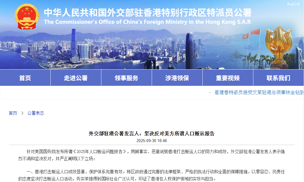 香港中通社9月30日電 針對美國國務院發佈所謂《2025年人口販運問題報告》,罔顧事實、惡意詆毀香港打擊販運人口的努力和成效,外交部駐港公署發言人30日表示強烈不滿和堅決反對。