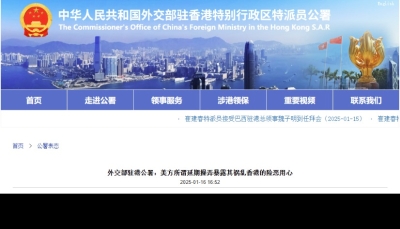 圖片來源:外交部駐港公署官網 發言人表示,香港打擊販運人口成效顯著,保護體系完善有效。特區政府通過完善的法律框架、嚴格的執法行動和全面的保障措施,以零容忍、負責任的態度堅決打擊販運人口活動,務實舉措得到國際社會廣泛認可,印證了香港在人權保護領域的實效與擔當。 發言人認為有關報告毫無公信力,不過是服務政治操弄的工具。美國年復一年炮製所謂人口販運報告,自我美化標榜為"一類國家",忽視自身存在嚴重的人口販運問題,卻以“教師爺”口吻對他國指手畫腳,充分暴露其自欺欺人的雙重標準。美方報告還借所謂販運人口抹黑香港國安法和國安條例,有關內容違背事實、充滿偏見,是對香港法治和人權狀況的惡意污蔑。 香港由治及興大勢所趨,發展前景不容詆毀。發言人強調,香港法治指數位居世界前列,國際金融中心地位更加穩固,營商環境持續優化,任何外部干預和污蔑抹黑都動搖不了香港繁榮穩定的堅實基礎,阻擋不了"一國兩制"行穩致遠的發展進程,阻擋不了香港融入國家發展大局的歷史大勢。敦促美方反躬自省,立即停止以"人權衛士"自居的雙標行徑,立即停止以各種藉口干預香港事務的政治操弄。(完) 【編輯:馬華】