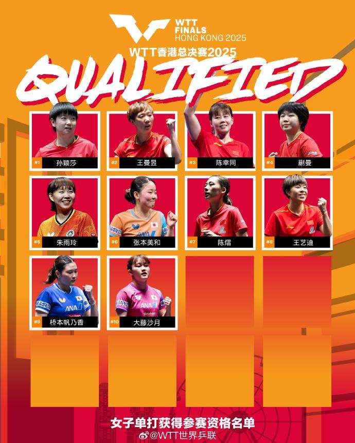香港新聞網10月7日電 2025年世界乒乓球職業大聯盟(WTT)香港總決賽將於12月10日至14日在香港紅磡體育館進行。WTT世界乒聯7日發布目前獲得2025年WTT香港總決賽參賽資格的名單,國乒包括孫穎莎、王楚欽等多人入選。