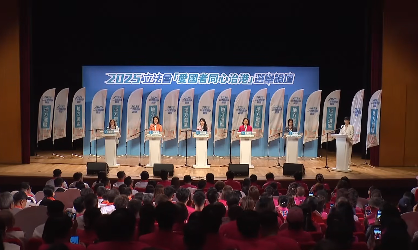 2025立法會“愛國者同心治港”選舉論壇(新界西南)。圖源:點新聞 首場論壇邀請新界西南地方選區候選人出席,該區共有5位、“全女班”候選人出席論壇,按編號由小至大排序分別是盧婉婷、郭芙蓉、陳穎欣、張文嘉、莫綺琪。 首個環節是自我介紹,候選人有3分30秒介紹政綱,助選團有30秒打氣時間。每位候選人就各自不同關注議題,包括區內交通、保障本地勞工、家庭友善政策、刺激地區經濟等展開闡述。其後還有提問、辯論環節,現場也有組選團打氣。