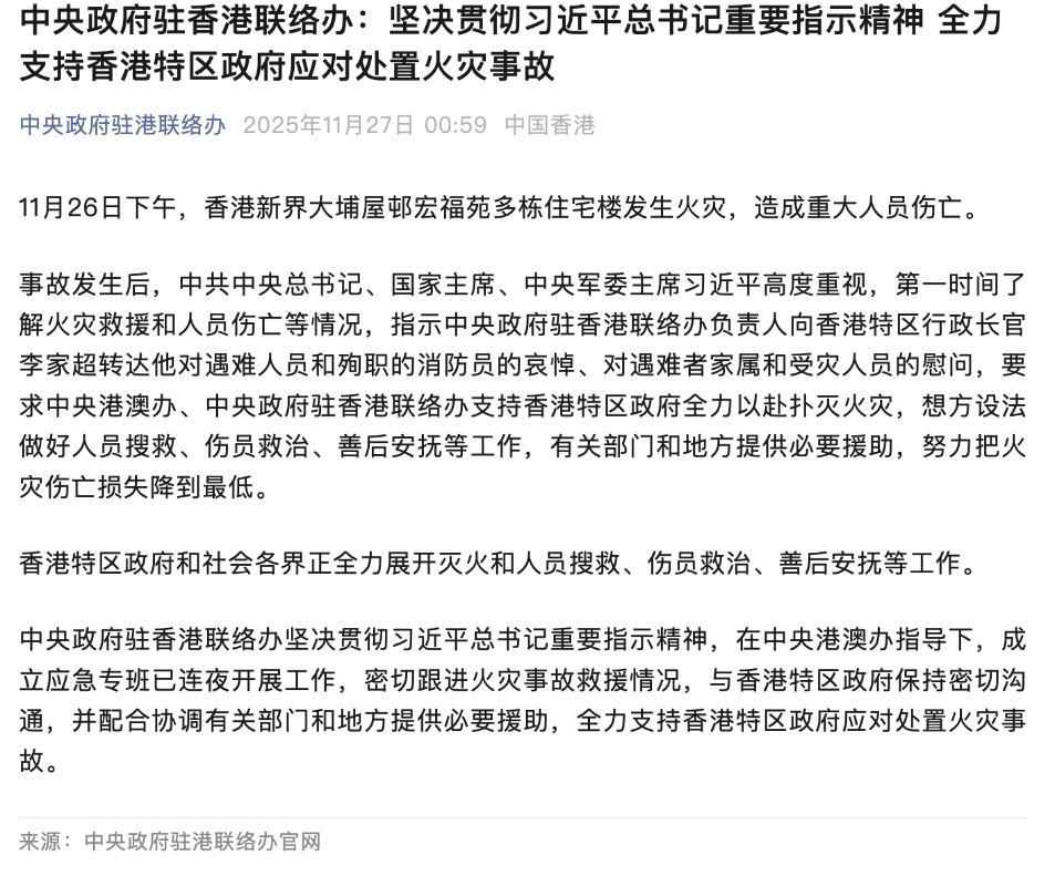事故發生後,中共中央總書記、國家主席、中央軍委主席習近平高度重視,第一時間了解火災救援和人員傷亡等情況,指示中央政府駐香港聯絡辦負責人向香港特區行政長官李家超轉達他對遇難人員和殉職的消防員的哀悼、對遇難者家屬和受災人員的慰問,要求中央港澳辦、中央政府駐香港聯絡辦支持香港特區政府全力以赴撲滅火災,想方設法做好人員搜救、傷員救治、善後安撫等工作,有關部門和地方提供必要援助,努力把火災傷亡損失降到最低。 香港特區政府和社會各界正全力展開滅火和人員搜救、傷員救治、善後安撫等工作。 中央政府駐香港聯絡辦堅決貫徹習近平總書記重要指示精神,在中央港澳辦指導下,成立應急專班已連夜持續開展工作,密切跟進火災事故救援情況,與香港特區政府保持密切溝通,并配合協調有關部門和地方提供必要援助,全力支持香港特區政府應對處置火災事故。(完) 【編輯:陳卓儀】