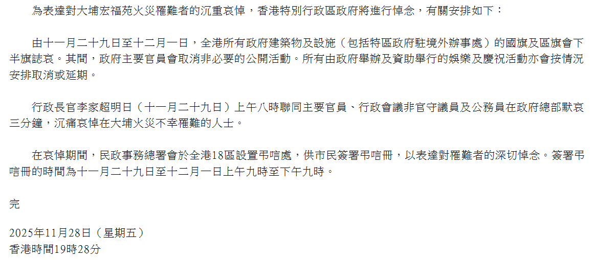 香港新聞網11月28日電 為表達對大埔宏福苑火災罹難者的沉重哀悼,香港特別行政區政府將進行悼念。