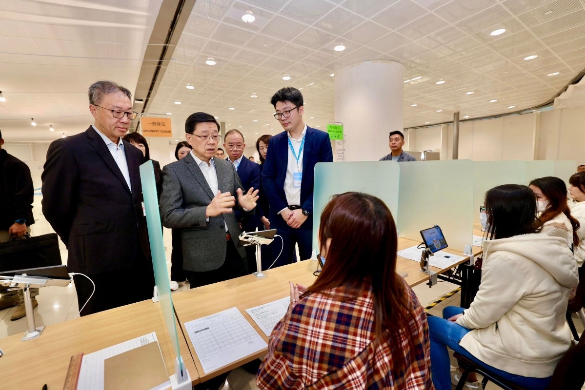 香港新聞網12月6日電 7日是香港立法會2025年換屆選舉投票日。香港特區行政長官李家超6日在選舉管理委員會主席陸啟康法官和政制及內地事務局局長曾國衞陪同下,視察立法會換屆選舉投票站。 李家超到訪位於東涌文東路體育館的一般投票站,以及設於港珠澳大橋香港口岸旅檢大樓的鄰近邊境投票站,視察票站的場地佈置及工作人員準備情況,觀看票站人員就電子選民登記冊系統發票安排及點票流程進行的演練,並為7日需長時間工作的同事打氣。