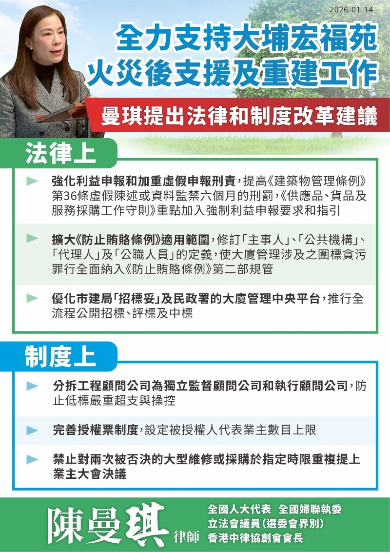 香港新聞網1月15日電 香港特區第八屆立法會首次會議本月14日上午舉行,議程聚焦大埔宏福苑災後支援及重建工作。會上,陳曼琪議員發言支持“有關大埔宏福苑火災後支援及重建工作”的政府議案,促特區政府盡快制定中長期的持續可行災後支援方案,並從法律及制度層面推動系統性改革。 陳曼琪議員提出“改善大廈維修工程管理”八大建議,防止圍標、天價超標,確保工程顧問獨立性、承建商質素及對小業主支援。