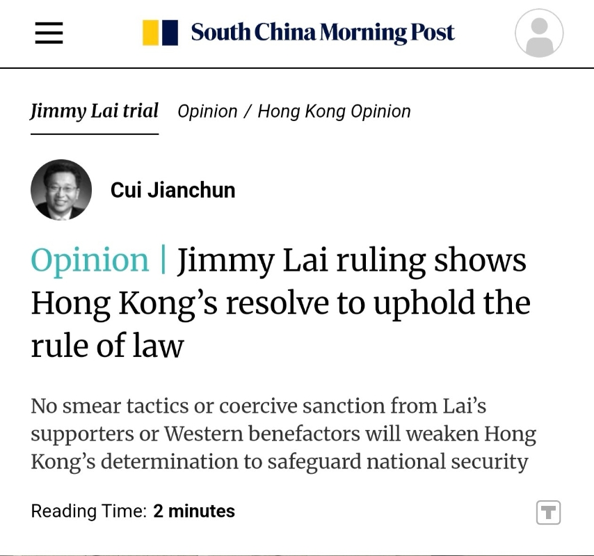 香港新聞網2月12日電 中國外交部駐港公署特派員崔建春11日在《南華早報》發表題為《黎智英案判決結果是法治的勝利》的署名文章。全文如下: