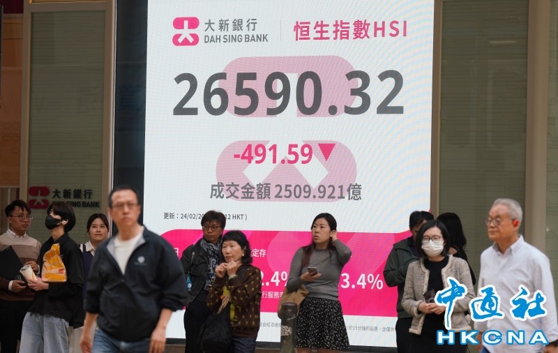 香港中通社2月24日電(記者 譚暢)受美股急跌所累,港股再見反覆,24日回吐。恆生指數全日跌491點或1.8%,報26590點。大市全日成交額約為2509.9億港元。