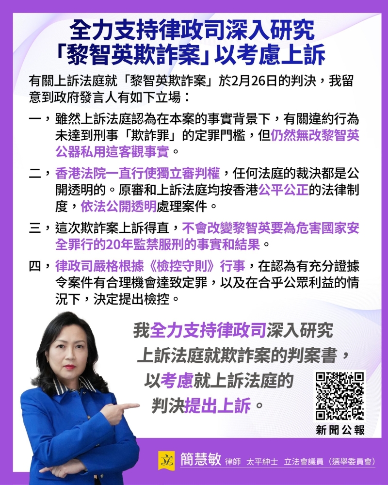 香港新聞網2月26日電 香港高等法院上訴庭26日就“黎智英欺詐科技園案”頒布裁決,壹傳媒集團創辦人黎智英及前行政總監黃偉強二人被裁定上訴得直。香港立法會議員簡慧敏表示,全力支持律政司深入研究上訴法庭就欺詐案的判案書,以考慮就上訴法庭的判決提出上訴。
