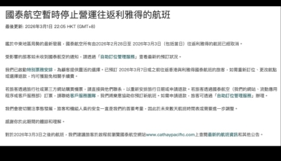 顧客和機組人員的安全是國泰的首要考慮。國泰表示,將繼續密切關注事態發展,為受影響顧客提供支援,並在檢視中東地區局勢後,再考慮恢復往返或飛越中東地區。顧客在出發前往機場前,可瀏覽國泰網頁了解最新航班安排。  (完)