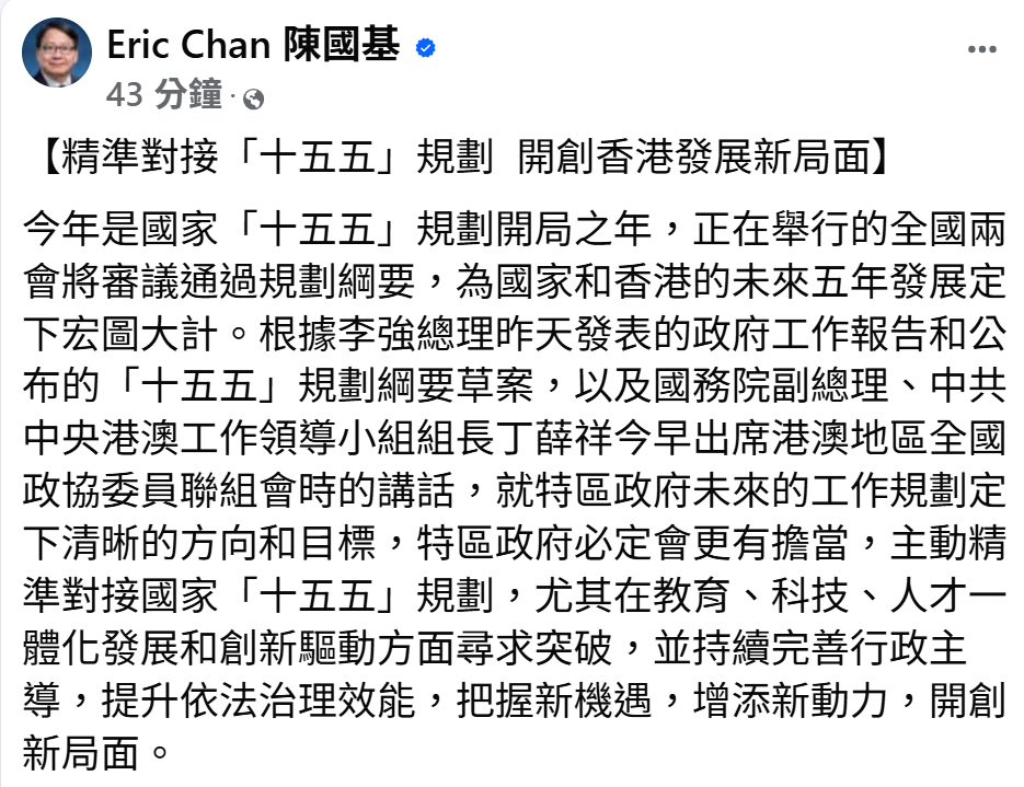 陳國基社交媒體專頁截圖 陳國基說,根據李強總理5日發表的政府工作報告和公布的“十五五”規劃綱要草案,以及國務院副總理、中共中央港澳工作領導小組組長丁薛祥今早出席港澳地區全國政協委員聯組會時的講話,就特區政府未來的工作規劃定下清晰的方向和目標,特區政府必定會更有擔當,主動精準對接國家“十五五”規劃,尤其在教育、科技、人才一體化發展和創新驅動方面尋求突破,並持續完善行政主導,提升依法治理效能,把握新機遇,增添新動力,開創新局面。 陳國基表示,去年12月習近平主席聽取行政長官述職報告時強調,香港要主動對接國家“十五五”規劃。現在規劃綱要即將通過,特區政府要結合政府工作報告,第一時間深入研究、全面把握規劃的主要目標指標、重大戰略任務、重大工程項目,準確領會規劃綱要港澳專章的總體要求和具體重點,在這個基礎上,統籌好各部門和各方各界的力量,著眼國家大局,結合香港實際情況,在行政長官的帶領下全速制定香港的第一個五年規劃,與國家發展精準對接,充分發揮香港的獨特優勢。 他指,特區政府亦要切實改革創新,整體推進教育、科技、人才一體化發展。“十五五”規劃和政府工作報告明確提出一體推進教科才發展的總體目標和措施,並具體提出支持香港建設國際創新科技中心、加快北部都會區建設、打造國際高端人才集聚高地等。他表示,由他主持的教育、科技和人才委員會,過去一年多已統籌多個特區政府部門和專上院校、專家學者,在教科才的協同發展方面推出一系列措施,取得初步成效。在此基礎上,特區政府將按照規劃綱要的要求和香港五年規劃的部署,進一步改革創新,加速香港國際創新科技中心建設,深化與內地的產學研創新協同,並全力高質量建設北都大學城,為香港高質量發展注入新動力。 他說,全力擔當作為,堅持和完善行政主導亦尤其重要。堅持和完善行政主導,是不斷提升香港特區依法治理效能的關鍵。特區政府會做好特區治理第一責任人的角色,把握大局,以更宏觀的思維規劃,充分發揮好香港背靠祖國、聯通世界的獨特優勢和重要作用;同時要善用立法會監督和配合施政的職能,推動社會各界、廣大市民支持、參與特區政府依法治理,讓行政主導發揮最大效能。 陳國基表示,國家“十五五”規劃為香港發展帶來前所未有的龐大發展機遇。在行政長官的領導下,政務司會全速推進對接工作,團結一心、奮發作為,在國家發展大局中發揮更大作用,也讓香港創造更輝煌的未來。(完) 【編輯:梁嘉軒】