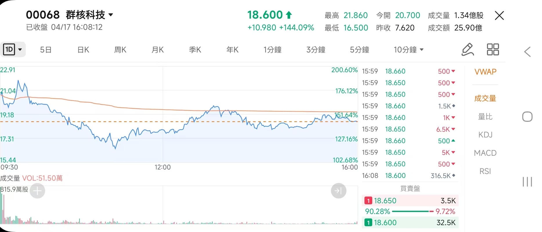 香港新聞網4月17日電“杭州六小龍”之一的Manycore Tech Inc.(群核科技,00068.HK)今日登陸港交所,正式在主板掛牌上市。作為“杭州六小龍”中首家登陸資本市場的公司,公司上市首日表現極為亮眼,群核科技發行價7.62港元,開盤價報20.70港元,較發行價大幅上漲171.65%,盤中最高觸及21.86港元,漲幅達186.88%。截至收盤,群核科技股價最終報18.60港元,較發行價上漲144.09%,總市值316億港元。