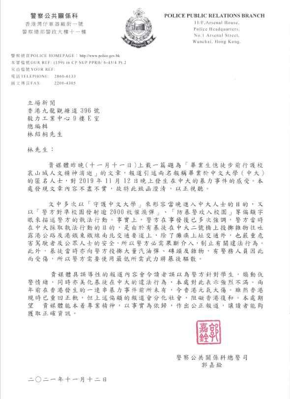 警方昨日(11月12日)就《立場新聞》周四(11日)晚發布一篇題為“畢業生憶徒步前行護校哀山城人文精神消逝”的報道,去信該媒體總編輯,指文章引述兩名報稱畢業於中文大學的匿名人士對前年11月12日晚中大的暴力事件,內容不盡不實,令讀者誤以為警方針對學生,煸動仇警情緒,亦美化暴徒在中大的違法行為,警方對此表示強烈不滿。
