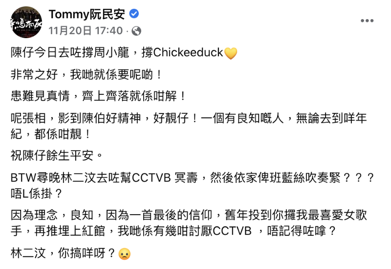 TVB日前舉行《萬千星輝賀台慶》(圖片來源:香港文匯報) 香港“黃藝人”阮民安日前發文竟將TVB台慶形容為“CCTVB冥壽”,更點名批鬥歌手林二汶參加台慶,同時不忘給自己臉上貼金,聲稱自己去年為林投票,令其奪得“我最喜愛女歌手”獎,之後又推其上紅館。阮民安最後不忘道德綁架一番:“林二汶,你在搞什麼?”“我們有多討厭CCTVB ,不記得了嗎?”