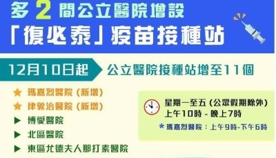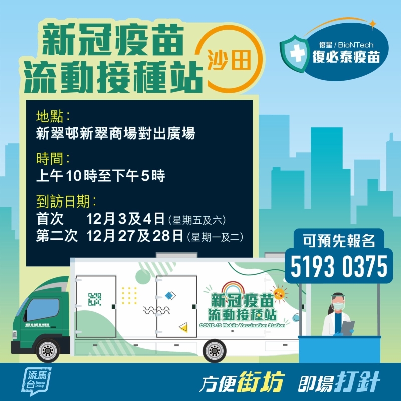 香港特區政府今日(2日)在社交專頁“添馬台”發文,指新冠疫苗流動接種車明日 (3日) 正式出動,第一站將到沙田新翠邨,提供復必泰疫苗接種。無論要打第一、第二或第三針都可以,呼籲街坊們尤其是長者和長期病患者快把握機會。