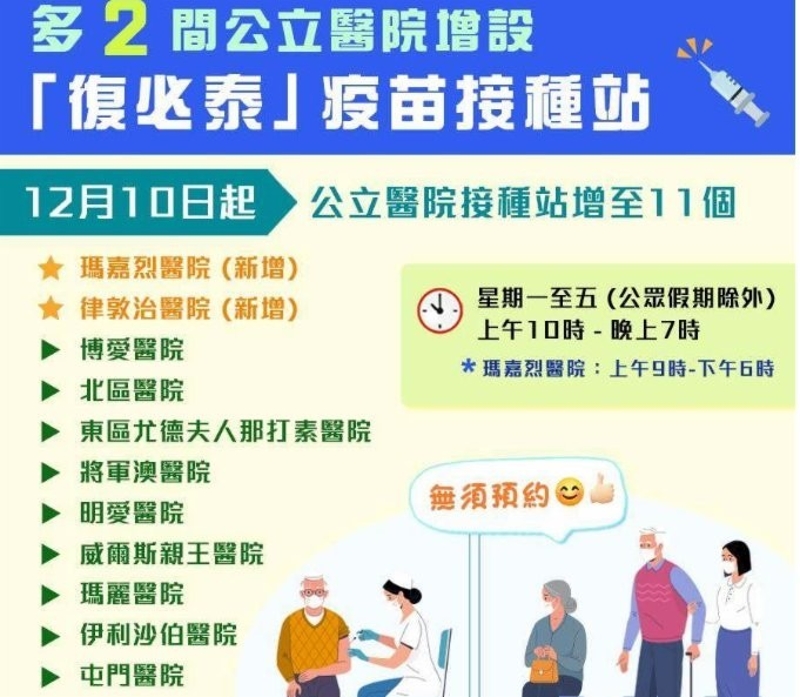 由今日(10日)起,香港再多兩間公立醫院增設新冠疫苗接種站,包括瑪嘉烈醫院和律敦治醫院,現時設有復必泰疫苗接種站的公立醫院增至11間。當局提醒,前去接種站打針毋須預約。