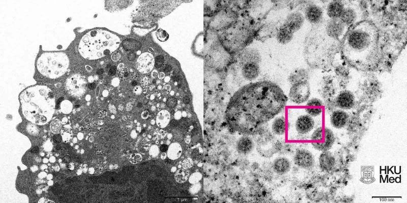 (圖左)低倍電子顯微鏡下感染新型冠狀病毒Omicron變異株後的猴腎細胞(Vero E6)。照片顯示細胞受損,腫脹囊泡,囊泡內含有黑色小病毒顆粒;(圖右)高倍電子顯微鏡下受感染的Vero E6細胞。照片顯示病毒顆粒,其表面呈現皇冠形的刺突蛋白(見紅框)。(香港大學醫學院供圖) 此外,SINOVAC科興與香港大學袁國勇院士團隊已簽訂合作協議,引進港大分離的奧密克戎變異株樣本,並於12月9日下午運抵北京,轉入中國醫學科學院醫學實驗動物研究所P3實驗室開展研究。 獲得新冠病毒奧密克戎變異株後,SINOVAC科興可更好地保障疫苗交叉中試驗和疫苗毒種篩選等研究開展,從而了解奧密克戎變異株對現有新冠疫苗的影響,並進而評價研製新冠病毒奧密克戎變異株疫苗的必要性。 SINOVAC科興具備成熟的新冠疫苗生產工藝和大規模生產能力,此前已開展了針對新冠病毒伽馬(Gamma)株和德爾塔(Delta)變異株新冠滅活疫苗研製工作。在新的奧密克戎變異株帶來新挑戰的背景下,SINOVAC科興也做好了開發新疫苗的所需準備,如有需要可快速推進新疫苗的研製和大規模生產工作。 【編輯:石欢欢】
