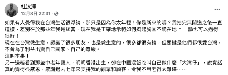 香港新聞網12月15日電 自稱“港裔台灣人”的杜汶澤又跳出來“碰瓷”了,這次他蹭熱度的對象瞄準了“大灣區哥哥”! 香港“黃絲”藝人杜汶澤近日在社交媒體回應被指“在台灣生活很浮誇”時聲稱,“現在是正確地示範,如何挺起胸膛不跪在地上舔,也可以過得很好”。他炫耀自己在台灣做生意認識了很多很有錢的朋友,關鍵是“他們都很愛台灣,不會為了利益出賣自己‘國家’、自己的尊嚴。”