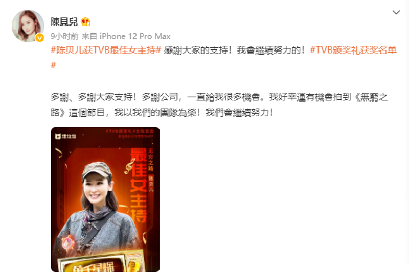 香港新聞網1月3日電 香港無線電視台(TVB)2日晚舉行“萬千星輝頒獎典禮2021”,其中陳貝兒憑專題及紀錄片《無窮之路》獲“最佳女主持”獎項,由於陳貝兒現時身處內地,未能回港出席頒獎禮,所以她通過視頻領獎。 對於此次獲獎,陳貝兒2日晚在微博發文表示,“感謝大家的支持!我會繼續努力的!”她說,“我好幸運有機會拍到《無窮之路》這個節目,我以我們的團隊為榮!我們會繼續努力!”