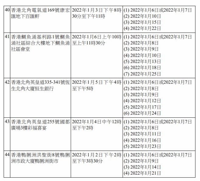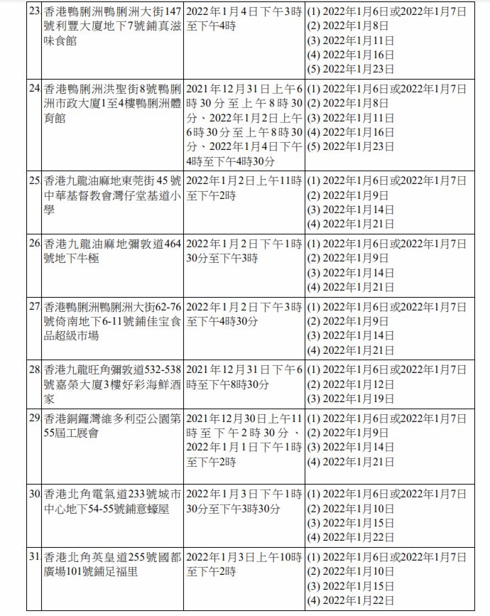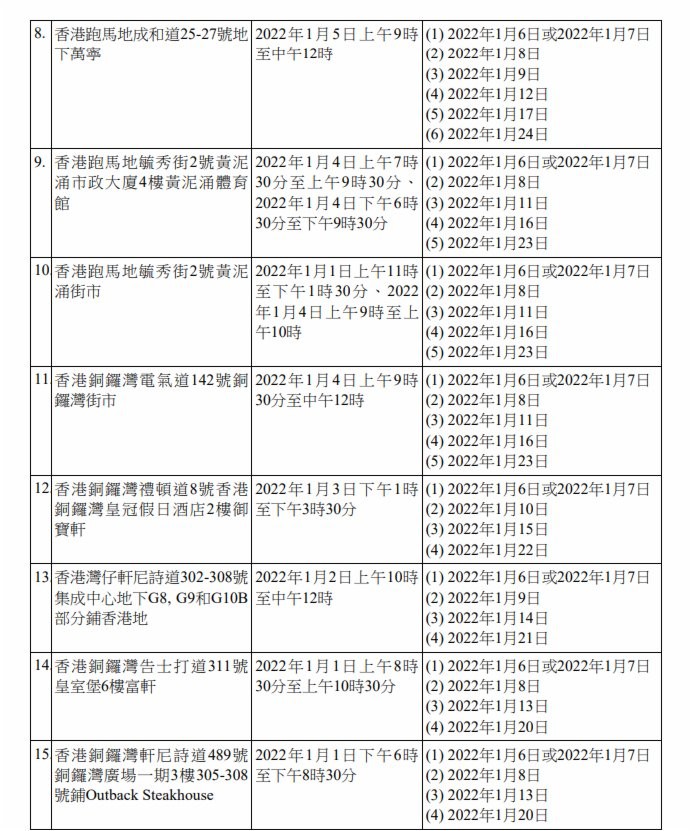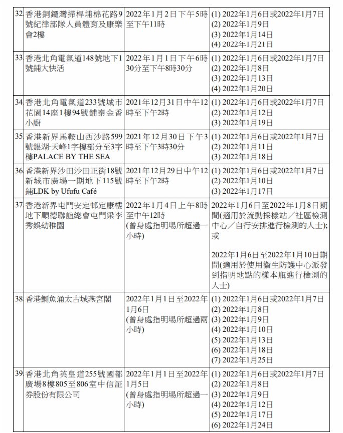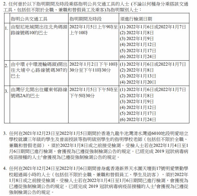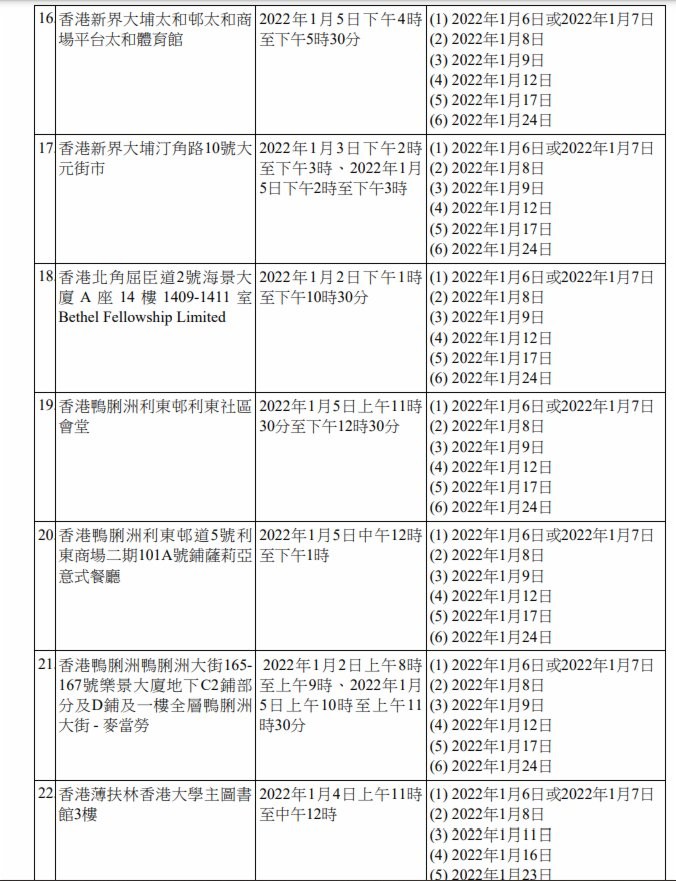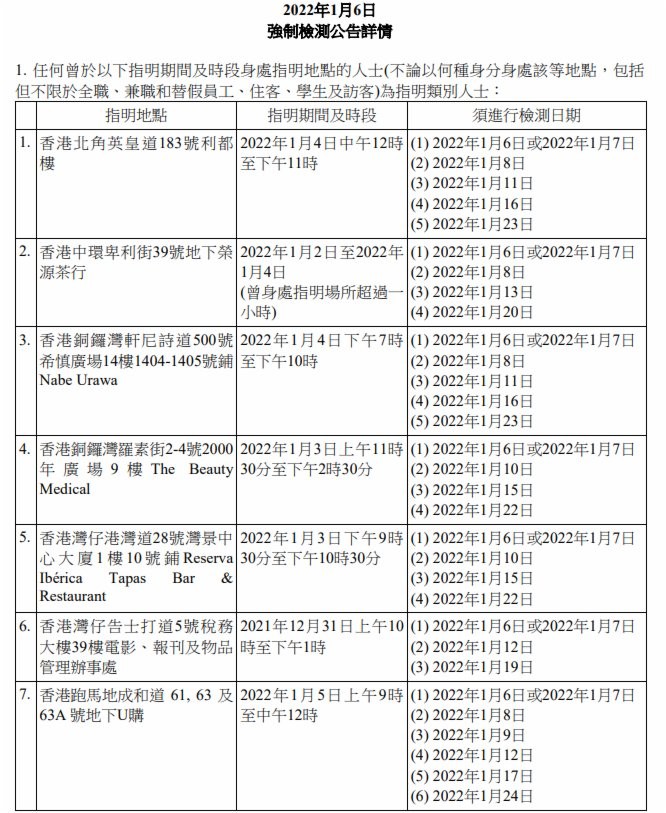 香港新聞網1月7日電 香港特區政府今日(7日)上午就強制檢測公告刊憲,因應9宗涉及變異病毒株的初步陽性檢測個案,有47個指明地方被納入強制檢測公告,已接種疫苗亦須接受強檢。 此外,2間學校爆發上呼吸道感染及/或流感樣疾病個案,有關疾病病徵與2019冠狀病毒病相似,為謹慎起見,相關學校或其指明級別被納入強制檢測公告。已完成疫苗接種人士獲視為已遵從強檢規定。 為截斷可能在社區出現的傳播鏈,政府提醒,任何在2021年12月31日上午8時至上午10時期間,曾身處香港天后歌頓道1A號地鋪“陸田園餐廳小廚”人士,須於1月6日或7日接受檢測,並在收到載有檢測結果的電話短訊通知後,盡快以電話(2125 1111/2125 1122)向衞生防護中心報告檢測結果。受檢人士不得遲於1月8日報告。