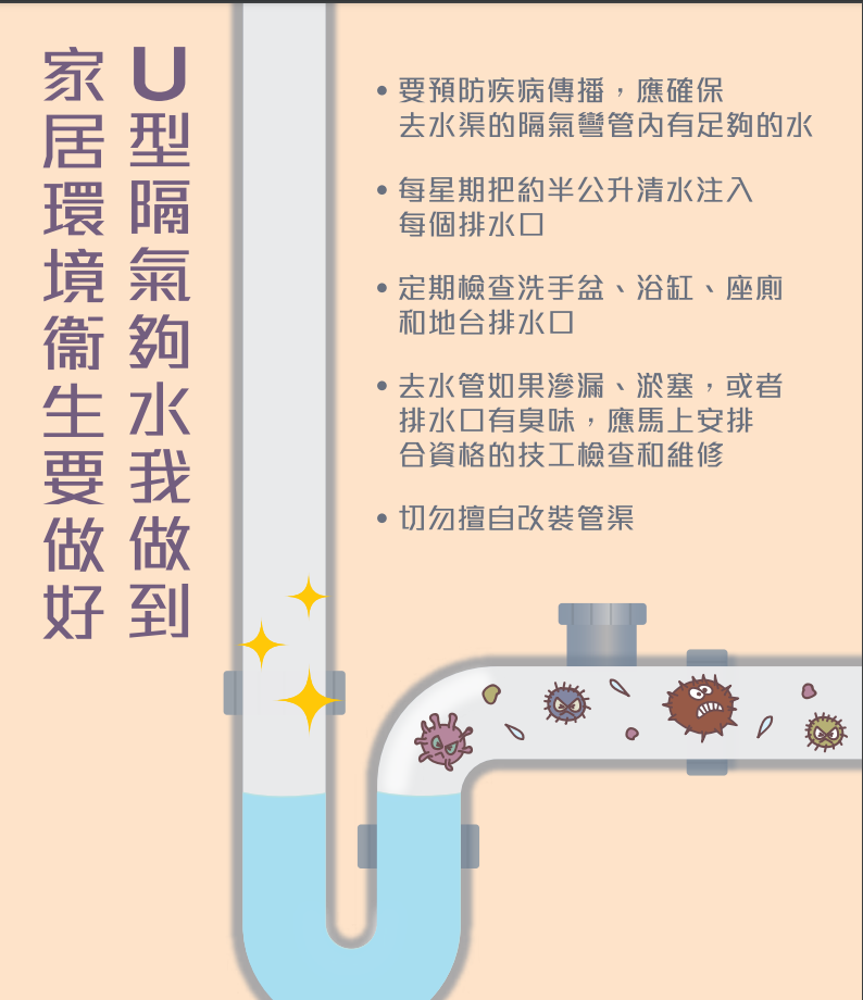 · 定期檢查,去水管如漏水或淤塞,或排水口發出臭氣,要立即安排合資格技工維修。(完)