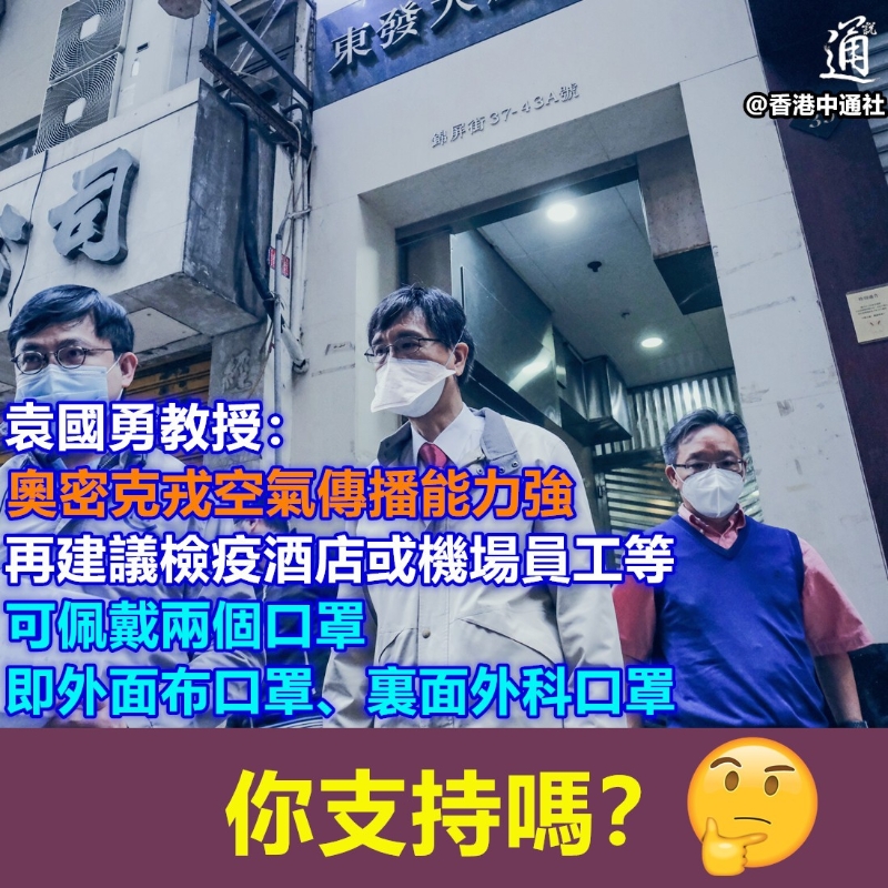 “空氣傳播能力很強!” 港大教授袁國勇再提戴兩個口罩防奧密克戎...分享到: