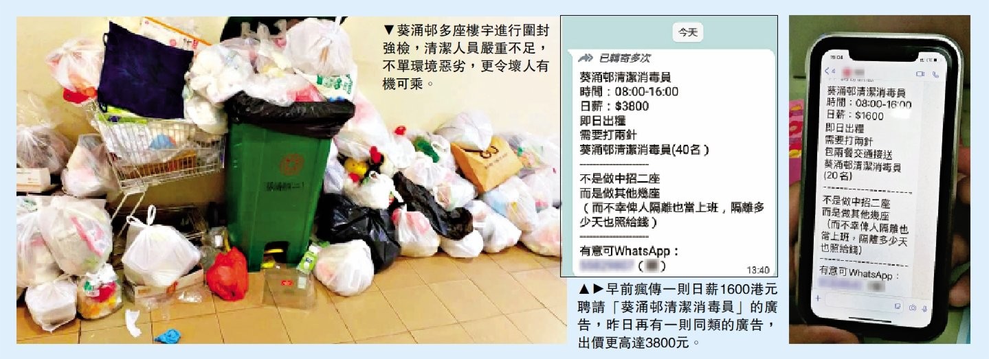 香港新聞網1月26日電 香港葵涌邨疫情大爆發,多座樓宇被圍封強檢,屋邨清潔人員嚴重不足,疑有不法之徒趁機利用通訊軟件“抽水”,發出虛假招聘廣告詐騙市民。 據香港《大公報》報道,繼23日網上瘋傳一則日薪1600元(港幣,下同)聘請“葵涌邨朝8午4清潔消毒員”訊息後,昨日(25日)再出現一則以“誇張價”日薪3800元聘請“葵涌邨清潔消毒員”的訊息。現時承辦葵涌邨清潔工作的公司表示,從沒有發出相關招聘廣告,提醒市民勿墮詐騙陷阱。 社交媒體昨日瘋傳一則聘請“葵涌邨清潔消毒員”的訊息,內容顯示工作時間為早上8時到下午4時,日薪高達3800元,並即日出糧,“需要打兩針”,名額40人。該廣告又強調不是在“中招”大廈做清潔,而是該邨其他樓宇,又聲稱若不幸被隔離也當上班,隔離多少天也照出糧,並留有一個名叫阿穎的聯絡電話。大公報記者致電欲聯絡阿穎,惟多次都表示電話正在使用中,無法聯絡對方了解情況。