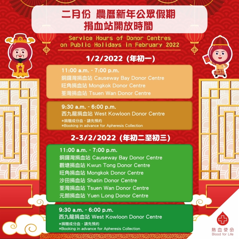 香港新聞網1月27日電 香港紅十字會輸血服務中心今日(27日)表示,現時血庫存量已下降至極低水平,只有約3至4日存量,緊急呼籲市民捐血,以確保病人有足夠血液作適切治療。 中心表示,公立醫院正值冬季服務高峰期,血液需求殷切,受第五波疫情影響,市民減少外出,影響捐血意欲,加上大部分機構及學界捐血活動被逼取消,血液收集量自本月初以來持續偏低,平均每天只有300至400包,不足以應付全港醫院每日所需。 大部分捐血站在農曆新年期間會照常開放,並會在年初一至年初四期間,向成功捐血的市民送贈福袋,中心建議市民先預約,避免輪候。