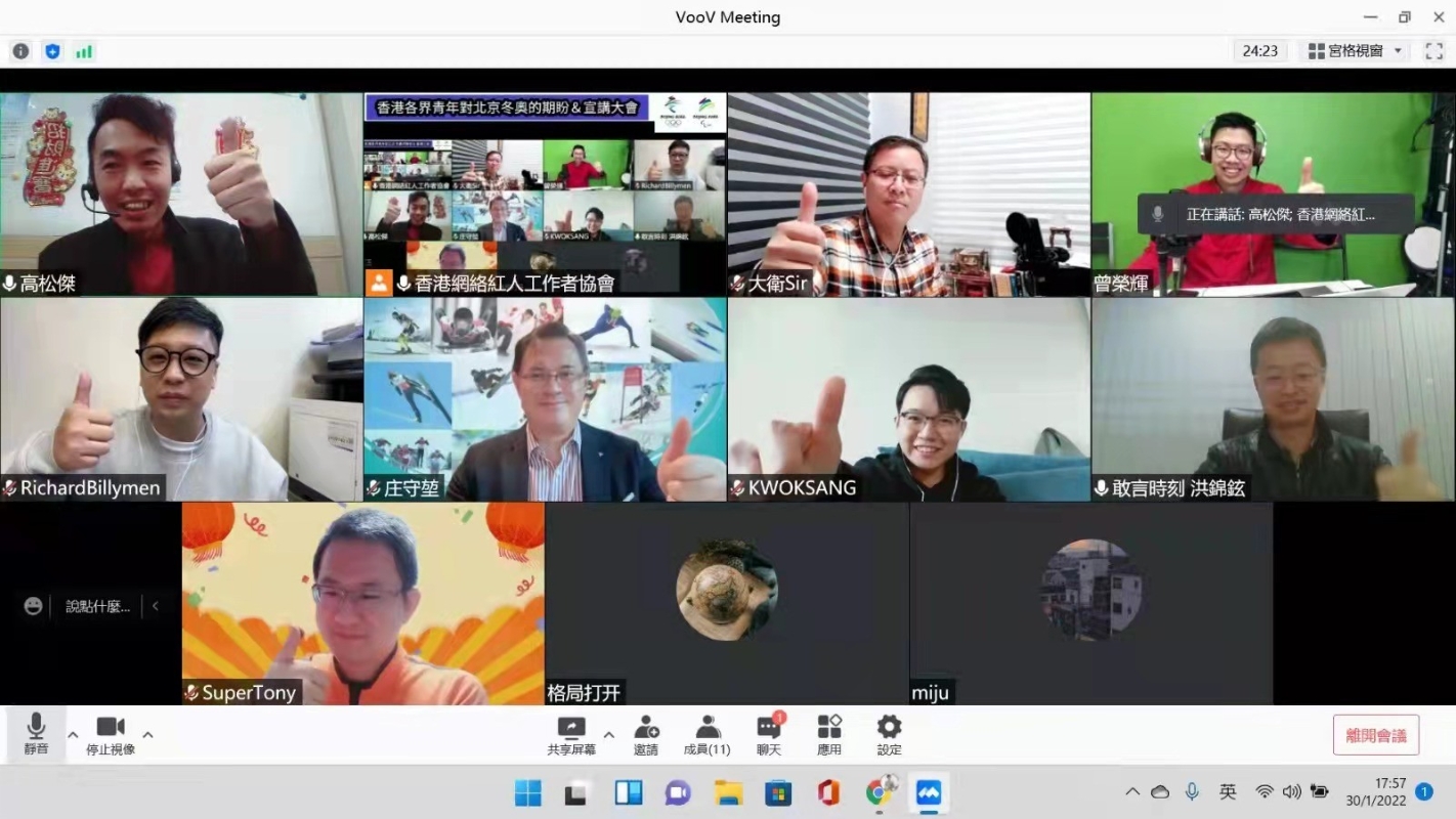 主辦的智庫及團體包括:粵港澳大灣區創新智庫、城市智庫、就是敢言、網絡紅人工作者協會及香港愛國青年KOL。會上分享了多個亮點,包括:志願者踴躍參與,傳遞志願服務精神;綠色奧運,切實“實現碳排放全部中和”;科技奧運,向著“更快更高更强”進發等。 粵港澳大灣區創新智庫主席莊守坤分享了冬奧在創新科技上的應用令世界大開眼界。因疫情特別採取“閉環管理”,冬奧為此特別打造“無人智慧餐廳”、“機器狗”、復興智能“5G+4K列車”。 莊守坤說,多個冬奧亮點,充分體現“綠色奧運、科技奧運、人民奧運”的理念,讓現場來自世界各國的選手和記者驚呼連連,也讓全球網友為之震撼。他希望香港年青人能透過冬奧更深入瞭解國家發展, 牢牢抓住百年一遇的發展良機, 融入國家發展大局, 成就自己美滿的人生。 網絡紅人工作者協會創會主席高松杰為北京將成為世界第一個“雙奧城市”感到作為中國人的光榮,香港青年應利用好香港的獨特優勢向國際講好中國故事、中國聲音、北京冬奧好故事。 就是敢言副主席吳志隆希望香港特區政府應推動宣傳北京冬奧訊息,讓香港年青人透過體育盛事瞭解國家。香港在去年東京奧運取得佳績,社會開始關注體育發展,透過北京冬奧,希望特區政府可以推動體育文化,進一步推動體育産業化,為年青人帶來更多元的就業機會。