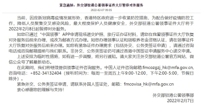 香港郵政 郵政總局及尖沙咀郵政局將於2月5日維持正常開門時間,但會提早於下午1時關閉。郵政總局將於6日暫停服務,其他郵政局營業時間不變。 運輸署 自2月4日起金鐘、長沙灣、觀塘及沙田的牌照事務處將會暫停即時申請的櫃位服務,但會繼續處理已在網上登記預約的櫃位服務,及經投遞箱、郵寄或網上遞交的申請;金鐘的公共車輛分組將會暫停提供即時申請的櫃位服務,市民可利用設於金鐘的香港牌照事務處的投遞箱遞交公共車輛牌照申請;金鐘的車輛記錄辦事處、駕駛執照記錄辦事處及違例駕駛記分辦事處將會暫停提供即時申請的櫃位服務;車輛檢驗中心會繼續為已預約的車輛提供車輛檢驗服務;臨時“樂悠咭”申請服務中心(沙田大圍顯和裏5號顯徑鄰裏社區中心2樓會議室)將暫停開放至2月17日。 醫療輔助隊 2月4日起只維持必要公眾服務至另行通知,包括所有抗疫工作、美沙酮診所運作及非緊急救護車服務。逢周末及公眾假期於單車徑及郊野公園的急救服務將暫停。 屋宇署 只提供緊急和必須的公共服務,主要處理公眾就樓宇安全及正在建造的僭建物的舉報、新發展項目的法定申請、承建商的註冊事宜、為發牌機構提供諮詢服務,以及推行樓宇更新大行動2.0的相關工作。 民政事務總署 所有社區會堂及社區中心(除用作臨時避寒中心、臨時庇護中心或疫情防控工作外)將繼續暫停開放至2月17日。2月4日至2月11日18區民政諮詢中心和民政總署遺產受益人支援組將暫時關閉。 入境事務處 由2月4日至11日只提供緊急和必須的公共服務。如緊急申請及領取香港旅行證件服務,申請人須先行在辦公時間內致電28523045作安排或查詢;只提供緊急補領身份證服務,申請人須先行預約(如對身份證事宜有任何查詢,請在辦公時間內致電35216565)。 稅務局 中央詢問處(只限有關離港人士清繳稅項的查詢)、商業登記署及印花稅署辦公時間為星期一至五上午9時至中午12時、下午1時30分至4時,中央電話查詢處辦公時間為星期一至五上午9時至中午12時30分、下午1時30分至4時。 教育局 各區的區域教育服務處、幼稚園及幼兒中心聯合辦事處2月4日起只提供緊急必須的公共服務及抗疫工作。有關安排暫定實行至2月21日。 香港海關 兩個辦事處由2月4日至11日(周六、日除外)期間如常開放,分別為北角渣華道222號海關總部大樓3樓顧客服務中心,以及九龍灣臨樂街19號南豐商業中心12樓1218-1222室金錢服務監理科辦事處。 政府新聞處 新聞處轄下位於北角政府合署的刊物銷售小組和圖片資料室2月4日起暫停櫃枱銷售服務。 土木工程拓展署 2月4日起暫停以下公共服務:土木工程圖書館、親身辦理《傾卸泥土執照》及《搬運沙粒許可證》的申請及礦務部牌照及許可證辦事處。 社會福利署 日間照顧服務均維持開放,惟服務量將下調。所有住宿照顧服務、綜合家庭服務中心、綜合服務中心、支援服務等,以及向免遣返聲請人提供的人道援助,均會繼續運作,以上除住宿照顧服務和熱線服務如常運作外,其他服務維持有限度服務。 機電工程署 轄下位於九龍灣總部的註冊及許可證辦事處2月4日起暫停服務,直至另行通告。在此期間,市民仍可透過機電署網頁、機電署流動應用程式、郵寄方式或設於機電署總部大樓地下大堂的投遞箱使用服務。該署會以電話或郵遞通知申請人有關申請結果。# 【編輯:崔靜雯】