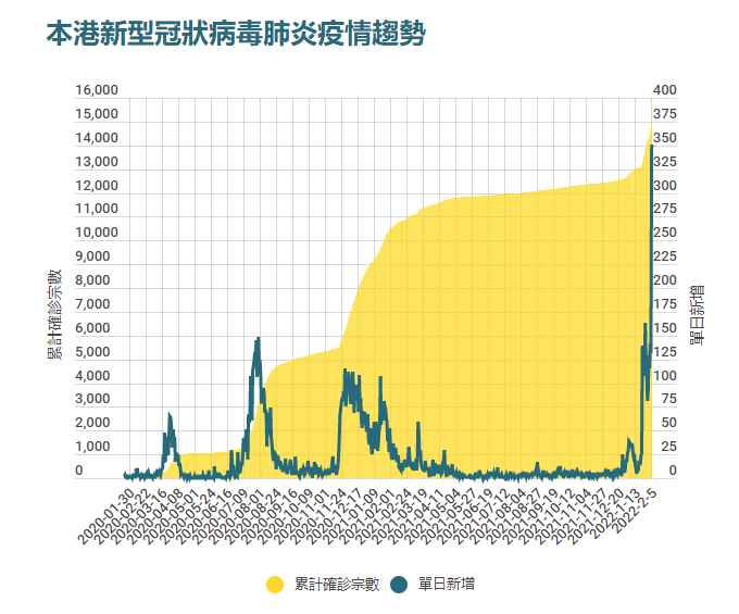 資料來源 :香港衛生防護中心 註:由2020年7月19日起,報告宗數為截至當日凌晨零時的過去24小時的確診人數;此前為截至當日下午4時的過去24小時宗數 ; #16/5/2021原11801患者被剔除,改以另一個替補;累計個案包括復陽個案 *衛生署3/9/2021宣布剔除5宗診所疫苗病毒株汙染樣本個案。 今日再增約340宗確診 據港媒消息稱,今日(2月6日)香港再增約340宗確診,再次逼近疫情以來單日新高,亦是連續兩日單日個案逾300宗,絕大部分為本地感染個案。 香港醫院管理局行政總裁高拔陞今天(2月6日)於電視節目承認,病床即將飽和,整體人手的壓力大,須調整其他服務,如減少非緊急的預約手術或治療服務。 但他指有信心處理今波疫情,惟須集中資源,優先處理須接受治療的病人。 他亦多次強調,醫管局的系統隨著疫情改變,以不斷調整策略及治療方案。