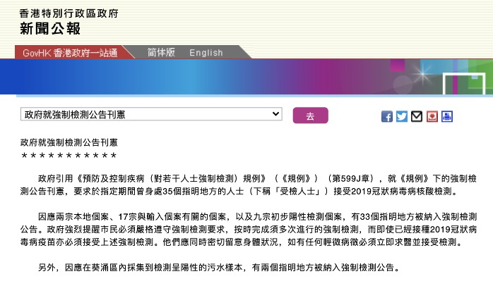 香港新聞網2月7日電 政府7日就強檢公告刊憲,因應65宗本地感染個案、1宗與輸入個案有關的個案,以及1宗初步陽性檢測個案,有56個指明地方被納入強制檢測公告,其中包括沙田新城市廣場、九龍帝京酒店等。 另外,因應在黃大仙、屯門和沙田採集到檢測呈陽性的污水樣本,有5個指明地方被納入強制檢測公告。