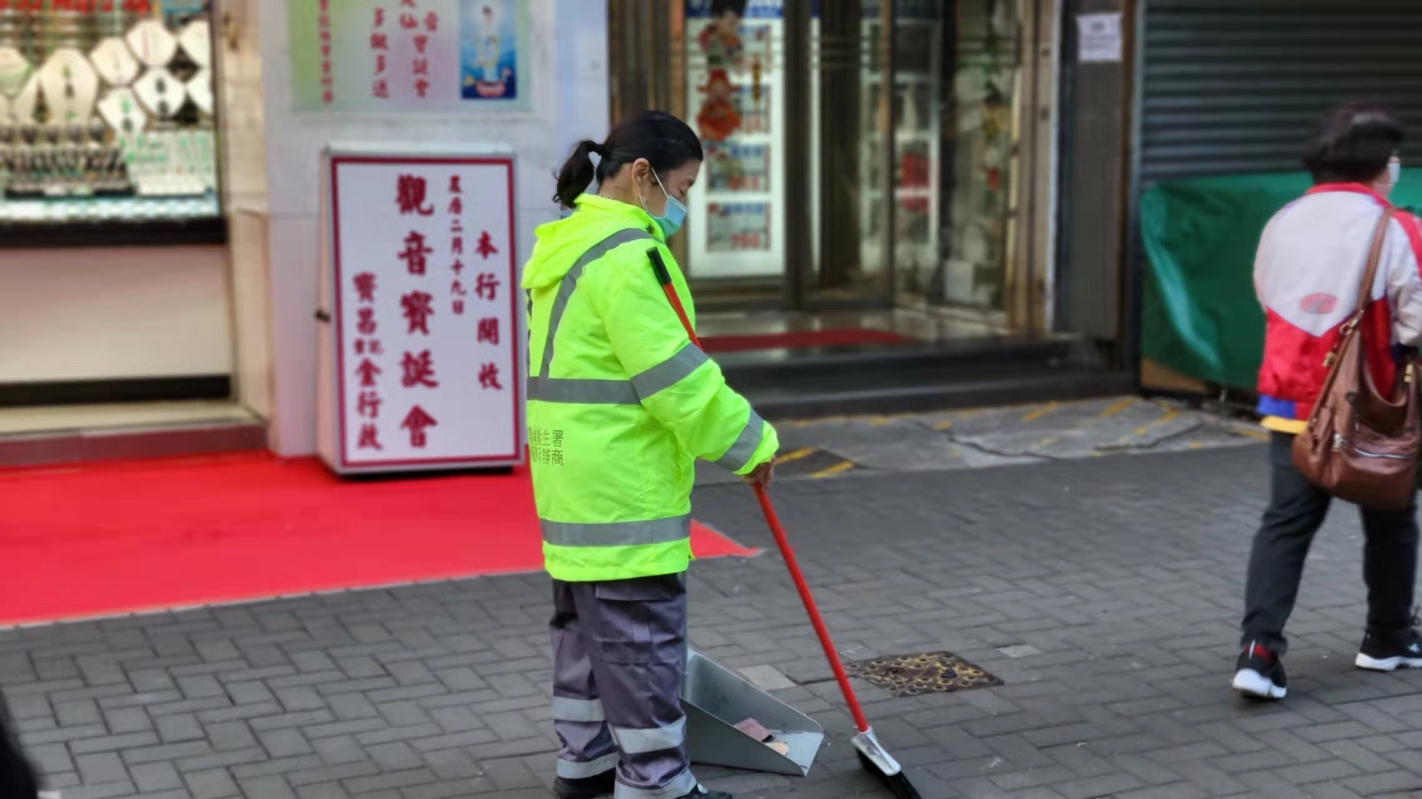 香港新聞網 張靜森 攝 雖然已經接種兩劑新冠疫苗,但面對絡繹不絕的路人,阿黎直言每天都很擔心不知道什麼時候就會“中招”,只能每14日檢測一次求平安。 剛入職的劉姐也面對同樣困境。香港第五波疫情初期,傳播力極強的奧密克戎變種病毒快速擴散,銅鑼灣至北角一帶屢現確診個案。劉姐所在的港島東成為疫情重災區,街上配戴N95口罩的市民也多了起來。但高危的工作環境下,一個外科口罩、適量的酒精搓手液卻是她僅有的防疫裝備。 近來,香港每日新增感染人數屢創新高,從葵涌邨、彩雲商場再到港鐵土瓜灣站,多名清潔員不幸感染;人手不足下,多個屋邨堆起垃圾山,居民抱怨之餘,卻鮮有人關注前線清潔員。