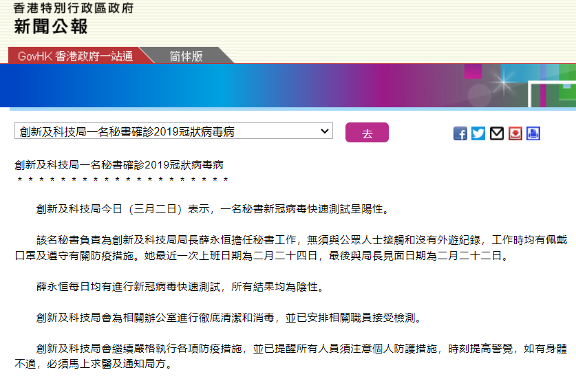 香港新聞網3月2日電 香港創新及科技局今日(2日)表示,該局一名秘書新冠病毒快速測試呈陽性。