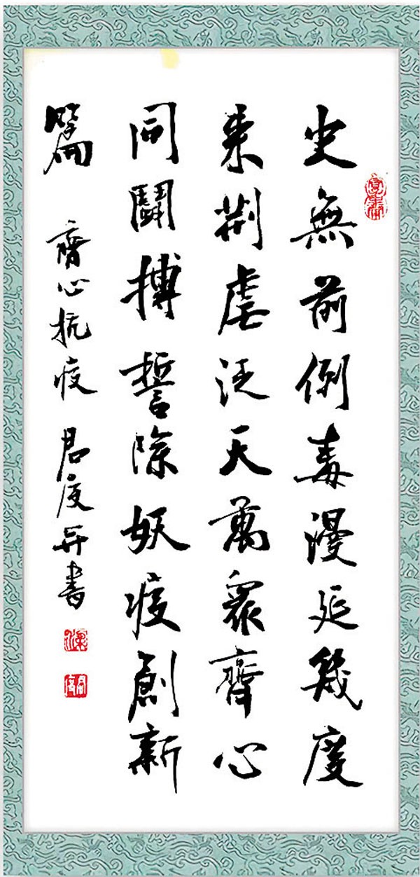 梁君度創作為抗疫打氣的書法作品 木雕刻家張醒熊(酉星): 醫護正是我們的守護神!大家要同心抗疫,共渡時艱!我製作了一個陶印作品《同心抗疫 四方平安 》,陶印以酸枝木製成,中間是用陶泥燒製的青龍、白虎、朱雀、玄武的瓦當圖案,是中國傳統東西南北的吉祥物和守護神。另一面也是陶泥燒製的隸書書法“東西南北,四方平安”八個字。底座柚木陽刻金文“四方平安”,四邊共鑲嵌28個陶製四靈平安印。我希望藉此創作祈求守護四方平安,疫症早日離去!