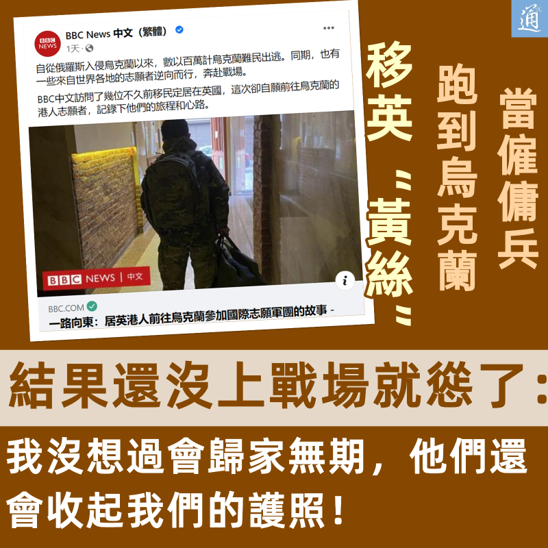 香港新聞網3月23日電 俄烏衝突持續,不少移民英國的“黃絲”也不甘寂寞,叫囂要去做志願軍,為烏克蘭盡一份心力。豈料,理想很“豐滿”,現實卻很“骨感”,還沒抵達戰場,他們就落荒而逃了…… 近日,英國媒體BBC採訪了幾名決意去烏克蘭做志願軍的移英“黃絲”,其中一人自稱曾在台灣接受過業餘槍擊訓練,一人則在香港做過註冊護士,兩人宣稱當年“修例風波”“未竟之志”成了他們決定奔赴烏克蘭的動力,還大言不慚地叫囂說,“自由是要用血去換的”。