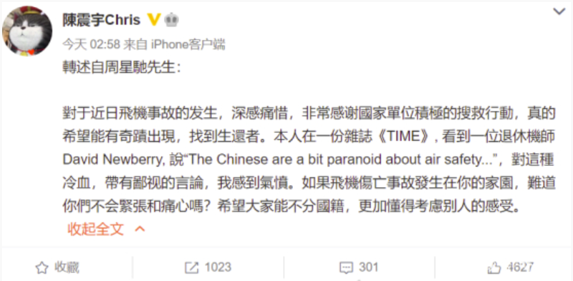 周星馳助手微博截圖 周星馳稱,對於近日飛機事故的發生“深感痛惜”,非常感謝國家積極的搜救行動,真的希望能有奇跡出現,找到生還者。 此外,周星馳還稱,自己在美國《TIME》(《時代》周刊)中看到一位退休機師說“The Chinese are a bit paranoid about air safety……(中國人對航空安全有些偏執……)”,他對這種冷血、帶有鄙視的言論感到氣憤。 《時代》周刊網站3月21日發佈了一篇題為《為什麼東航客機墜毀事件對該國衝擊如此之大》的報道。其中名為大衛·紐伯里的已在香港退休的機長、飛機事故調查員對該周刊說,“這對他們而言,會是個巨大的衝擊,”“中國人對航空安全有些偏執,毫無疑問,他們會對這次事件大發雷霆。” “如果飛機傷亡事故發生在你的家園,難道你們不會緊張和痛心嗎?”周星馳這樣質問這名外籍機長,並表示希望大家能不分國籍,更加懂得考慮別人的感受。(完) 【編輯:李彥洲】