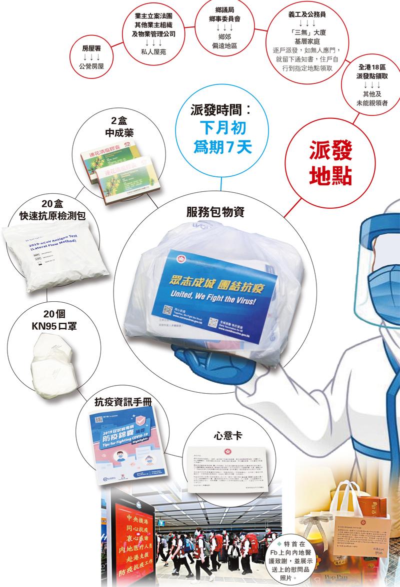 林鄭月娥3月25日在抗疫記者會上介紹,特區政府在派發防疫物資方面做了不少工作,包括派予執行抗疫工作的前線人員包括公務員、保安員及清潔員等,每日派發量高達200萬包;創新及科技局向須家居隔離或檢疫的巿民已派發近100萬個抗疫物資包;38萬名圍封強檢居民亦獲提供食物包和快速抗原測試包與中成藥;污水檢測呈陽性區域派發了逾1,000萬套快速抗原測試包。 她指出,在中央支援下,現時防疫物資供應充足,政府遂決定展開更廣泛及更有系統的派發行動,對象向全港300萬個家庭派發防疫服務包,並呼籲市民收到抗疫包內的快速抗原測試劑後應更頻密地使用,若測試呈陽性,需24小時內向衞生防護中心的系統申報,從而讓政府更掌握疫情及精準地為高風險患者提供適切和及時支援。市民亦可透過申報獲得正式紀錄,以便日後處理疫苗接種事宜、病假安排和出行證明等,而市民多做快速測試,也能起廣泛的社會篩查作用。 陳積志補充,防疫包內主要是中央援港的抗疫物資,包括有中成藥、抗疫用品包括快速測試、KN95口罩及抗疫資訊手冊和心意卡,稍後先進行包裝工序,下月初則在全港18區派發,目標7天內完成。 特區政府已發信邀請全體立法會議員、逾400個義工團體、社團、地區組織、同鄉會等,動員義工參與包裝及派送工作,反應熱烈,截至前晚已收到逾350個團體的正面回覆,有逾1萬名義工報名,多達5.8萬人次出勤,政府會因應計劃仔細分工,作出適當人手調配。