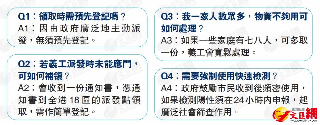 “三無廈”上門逐戶派發 陳積志表示,會透過多條渠道發放,其中居於公屋及私人屋苑的住戶,會在出入住所時獲房屋署或管理公司派發,“三無”大廈及基層家庭則由義工及公務員上門逐家逐戶派發,另透過鄉議局及鄉事委員會向鄉郊和偏遠地區住戶派發。同時,為補漏拾遺,倘派發物資時“摸門釘”,他們會留下通知書,讓市民持通知書到設於18區的派發點領取。 他續說,全港會在學校、社區會堂和體育館等100多個地點進行包裝工作,至於派發點數目和地點則需要機動性,視乎派發情況,若某地區不少人在派發時沒人應門,會在該區多設派發點,派發點未必固定是學校、體育館,亦可擺設街站,但目前未有數目。