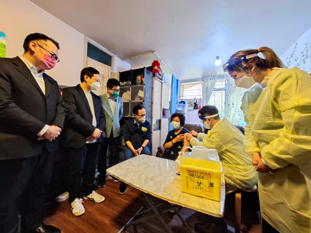 聶德權(左四)到街坊家裡實地考察疫苗接種外展隊工作 “全港抗疫義工同盟”聯同“觀塘民政事務處”、“九龍社團聯會觀塘地區委會”、“民建聯觀塘支部”、“工聯會觀塘地區服務處”、“九龍東潮人聯會”、“九龍東區各界聯會”、“香港廣西社團總會”、“香港廣西(九龍東)服務中心”、“灣區智匯”、“香港金平聯誼會”、“天恩醫療中心”及“醫思健康”等一眾團體和機構,共同發起這次疫苗接種活動。 在活動首日,香港特區政府公務員事務局局長聶德權親臨秀茂坪社區會堂打氣,鼓勵不同機構和地區人士齊心在地區推動疫苗接種。其後,他上樓到街坊家裡實地考察疫苗接種外展隊工作。 聶德權表示,特區政府由1月起已先後增加18個疫苗接種中心,現在疫苗接種中心都是“針等人”,預約十分容易。他說,爭取在4月底提高第二劑疫苗接種率至九成,並提升兒童、青少年、長者及院舍院友的疫苗接種率。