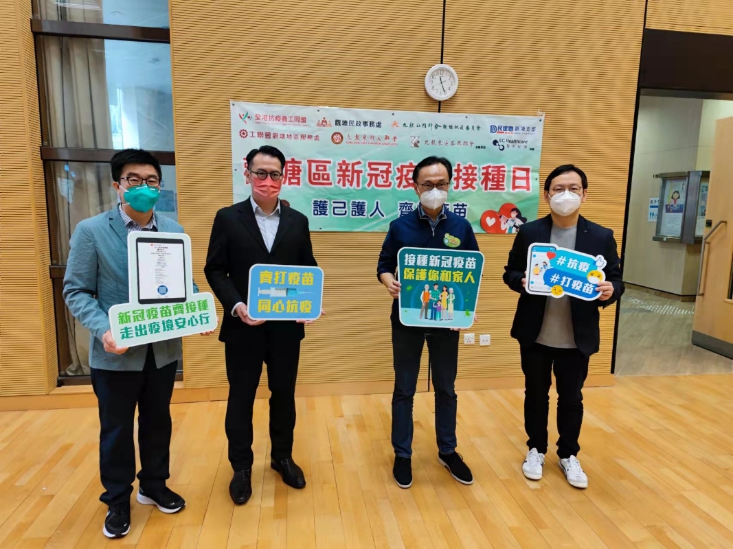觀塘區新冠疫苗接種日活動 “全港社區抗疫連線”與“香港義工聯盟”自3月初聯合發起“全港抗疫義工同盟”以來,為配合政府及社會各方抗疫工程,動員義工啟動一系列民間抗疫工作,希望藉此喚起社會關注,並呼籲更多的機構和團體能積極參與開展疫苗接種活動,集結社會各方力量和資源,全力提升全港疫苗接種率。(完) 【編輯:黎金良】