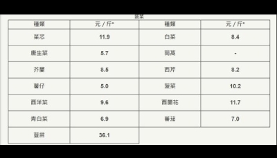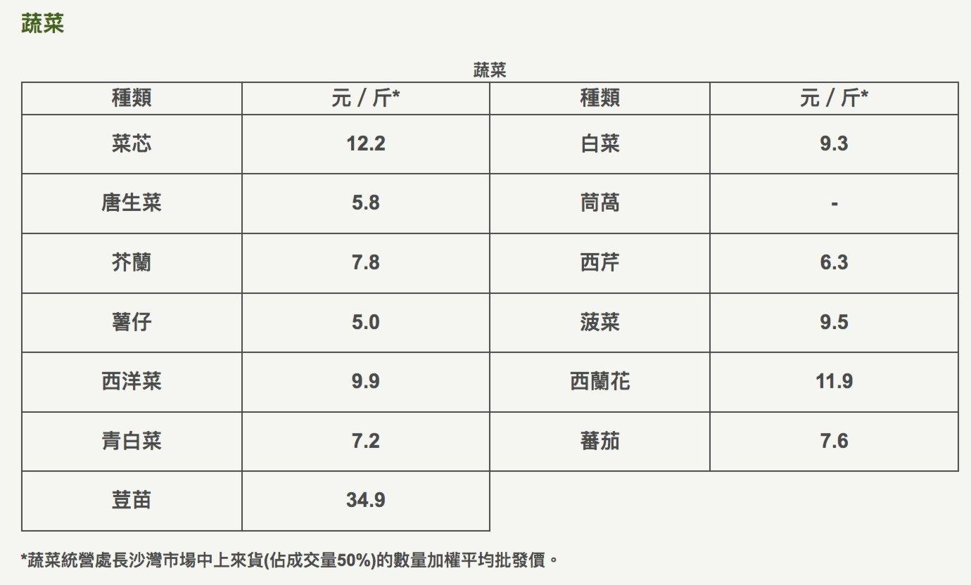 香港新聞網4月5日電 香港特區政府5日表示,4日由內地進口本港的鮮活食品供應充足穩定。截至4日午夜,內地經陸路和水路抵港的蔬菜供應量近2400公噸,與平日內地供應量相若,菜芯及白菜昨日的平均批發價分別為每斤12.9港元及8.3港元。 4日蔬菜統營處長沙灣市場中上來貨(佔成交量50%)的數量加權平均批發價。