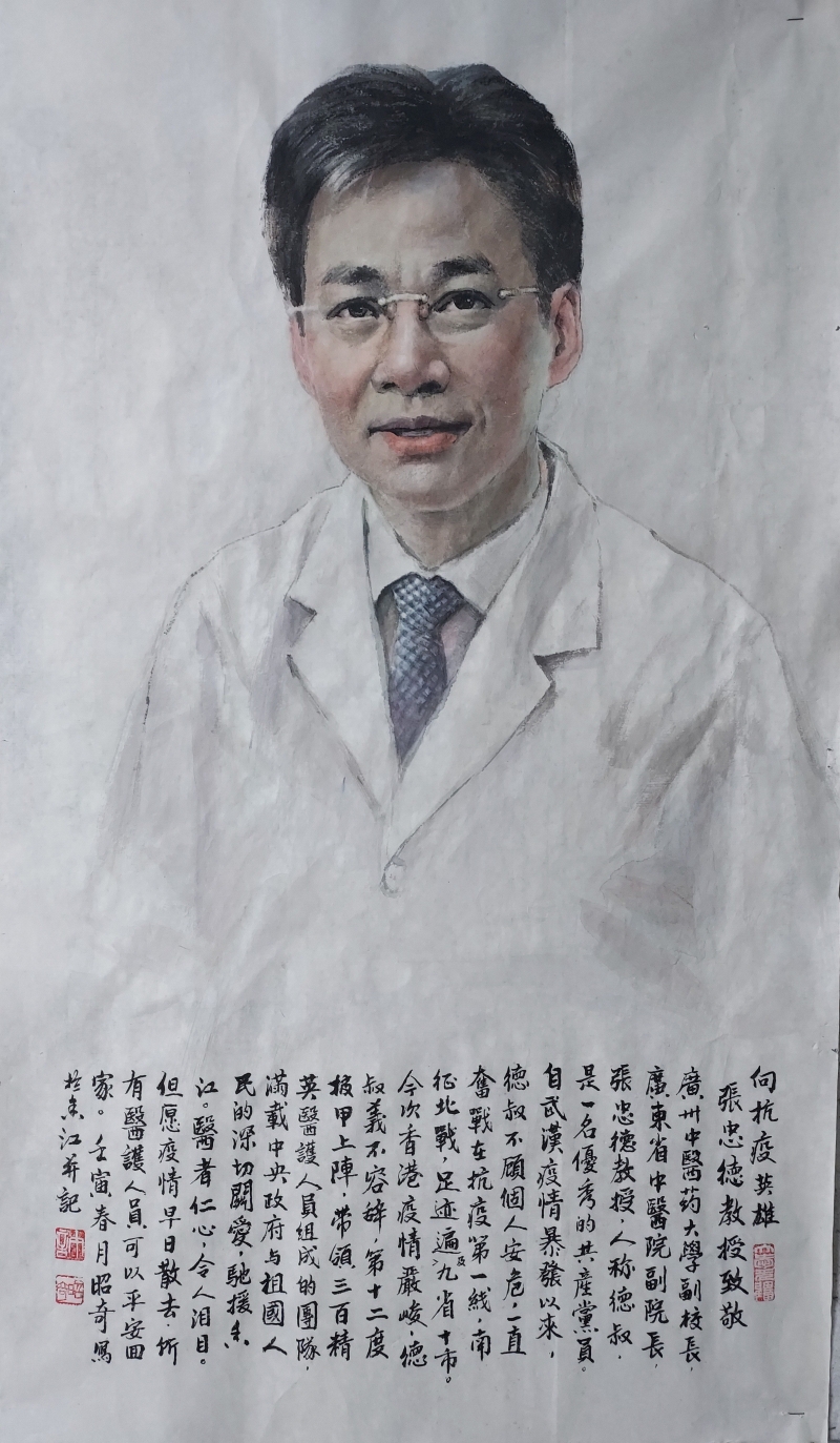 畫家許昭奇先生寄來的作品,特意描繪內地抗疫援港領隊的形象,他表示,“通過繪畫援港醫護領隊張忠德教授來表達自己對內地援港醫護的敬意,希望香港市民不要忘記他們對香港的幫助,也算是以自己的力量為香港抗疫作出一分力,期望疫情能早日完結民生安泰!”。