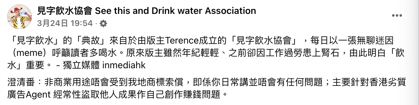 該協會又辯稱,註冊商標主要針對“香港劣質廣告公關”經常性盜取他人成果,作自己的創作賺錢;而非商業用途不會受到商標索償,日常使用不會有任何問題。 對於協會的解釋,多數網友並不買賬。 對於協會強調“見字飲水”的出處源於他們,有網友指出,這四個字早在2018年便出現在社交平台YouTube,認為其是由一眾網友捧紅,不應由任何一人或一個組織所擁有。 而在“修例風波”期間,大肆使用“見字飲水”四字並歪曲其含義的“黃絲”們也大為不滿,稱協會的“見字飲水”是提醒人們記得飲水,而他們所說的“見字飲水”含有另一層政治含義,完全不一樣。直斥協會利用了“手足”,看到“見字飲水”“ 走紅”後想收割一波“韭菜”,質問“什麼時候分錢給幫你捧紅這四個字的推手?”