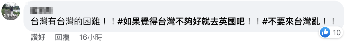 “如果覺得台灣不夠好就去英國吧!不要來台灣亂!”還有網友直斥香港“手足”。