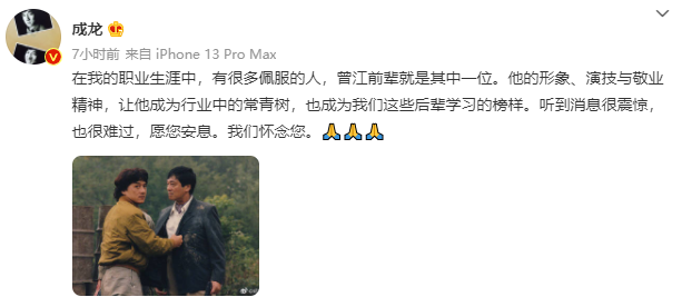 香港藝人成龍悼念曾江:很震驚,曾江是職業生涯中佩服的人分享到:
