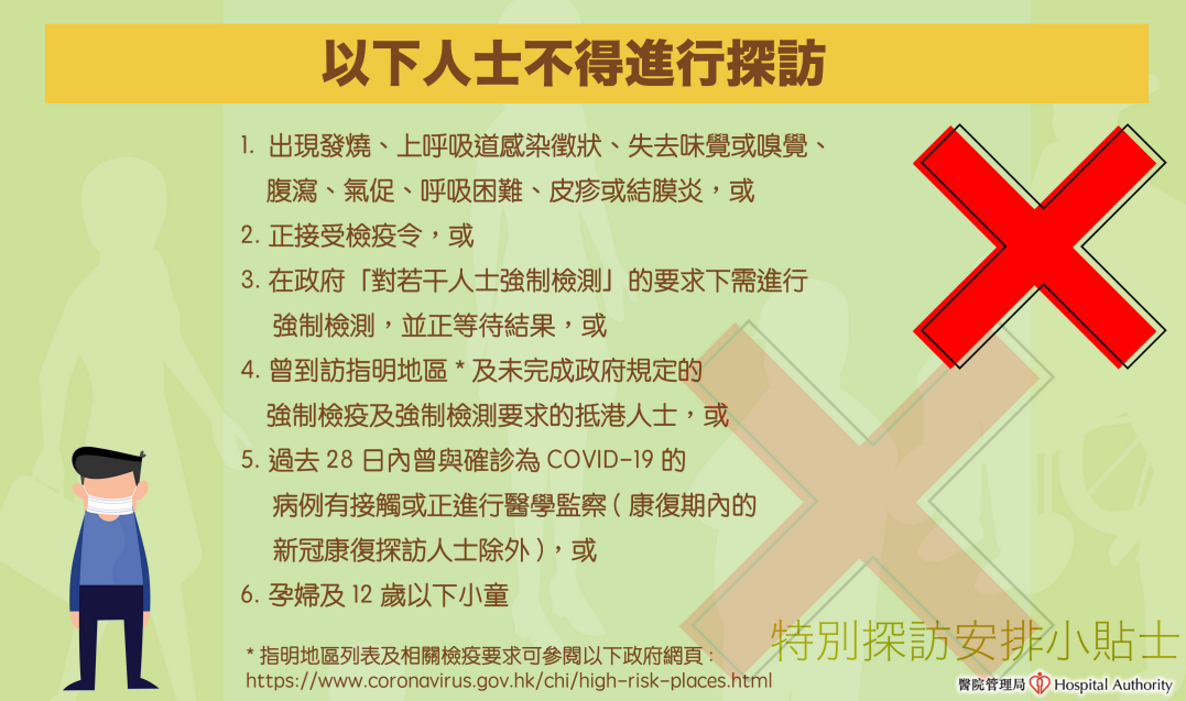 探訪人士必須已完成接種兩劑新冠疫苗不少於14天,並提供48小時內的核酸檢測陰性結果證明,或探訪前24小時內的快速抗原測試陰性結果證明。 26間恢復非急症病房及部門特別探訪安排的公立醫院包括: 港島東聯網 舂磡角慈氏護養院 律敦治醫院 東華東院 黃竹坑醫院 港島西聯網 葛量洪醫院 麥理浩復康院 大口環根德公爵夫人兒童醫院 東華三院馮堯敬醫院 東華醫院 九龍中聯網 靈實醫院 九龍東聯網 香港佛教醫院 九龍醫院 聖母醫院 東華三院黃大仙醫院 九龍西聯網 明愛醫院 北大嶼山醫院 瑪嘉烈醫院 仁濟醫院 新界東聯網 白普理寧養中心 沙田慈氏護養院 北區醫院 沙田醫院 大埔醫院 新界西聯網 博愛醫院 小欖醫院 屯門醫院 【編輯:刘春】