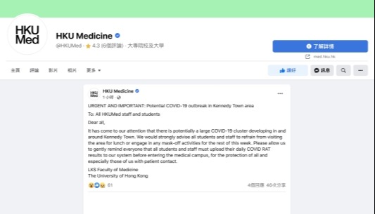 香港新聞網5月13日電 香港大學醫學院昨早(12日)在社交平台向師生作強烈呼籲,本周內應避免在堅尼地城一帶用膳及進行任何需要脫去口罩的活動,事件惹來熱議。港大感染及傳染病中心總監何栢良指,醫學院做法小心,才強烈呼籲師生暫時不要在堅尼地城午膳,認為居民只要打齊針,就可以放心外出用膳。 何栢良表示,醫學院幾乎所有師生都已經完成接種3劑疫苗,有相當強的防禦力,而且每日都有做快速檢測,而過去1周醫管局職員的檢測和病人篩查亦幾乎無發現陽性個案,認為醫院的安排對病人已有足夠的保障。