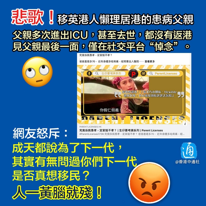 香港新聞網5月17日電 港人移英再現反面教材!近日香港一位女網友在社交平台討論區投稿,斥其姐姐在父親病情反覆之際,以“為了下一代”為藉口竟舉家移民,就連父親離世也未有回港見其最後一面。 對此,香港網友紛紛怒斥姐姐“不孝”,認為事件屬移民悲歌!