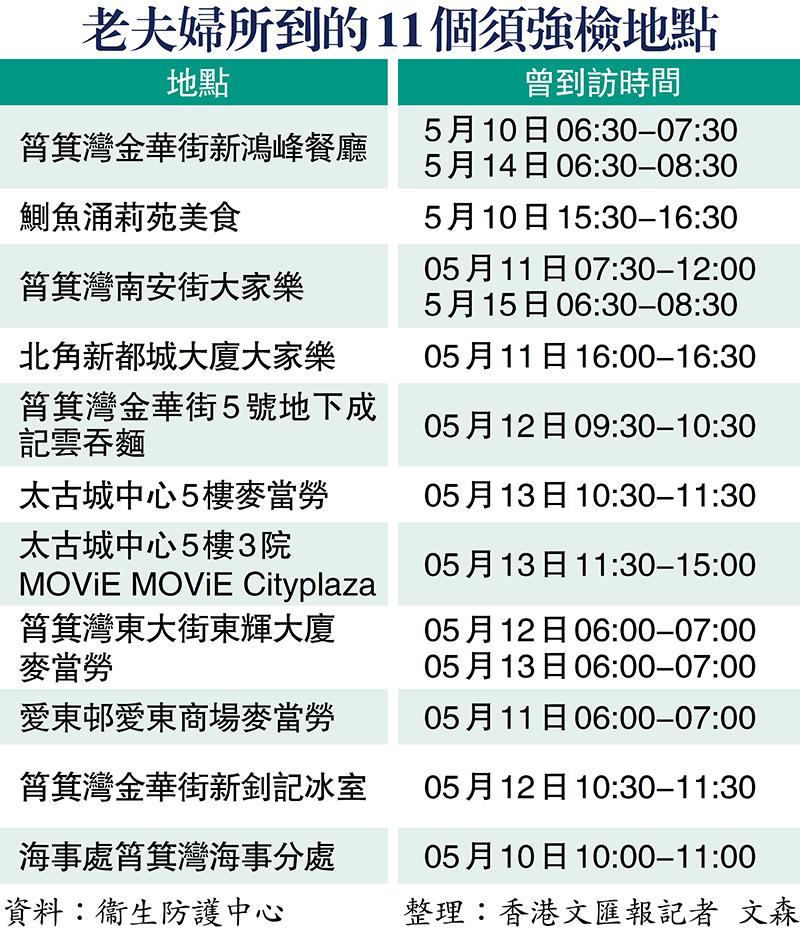衞生防護中心傳染病處首席醫生歐家榮昨日在疫情簡報會上表示,該對進入社區後才驗出陽性的夫婦分別為65歲及64歲,均已接種三針疫苗。兩人於本月3日從美國三藩市抵港,入住九如坊蘭桂坊酒店3204號房間檢疫,一直檢測呈陰性,其後於本月10日完成檢疫後返回筲箕灣住所。 5月12日,64歲的太太出現病徵,包括發燒、咳嗽、流鼻水和頭痛,其後與丈夫於本月14日到社區檢測中心檢測呈陽,帶有BA.2.12.1。太太的Ct值為15,病毒量高;丈夫一直無病徵,CT值32,病毒量低。兩人之前並無確診紀錄。 6天遊走 11處所列入強檢 由於兩人在5月10日至15日間曾在社區活動,包括曾到過英皇道新都城大廈大家樂、太古城麥當勞等,11個處所被列入強檢名單。