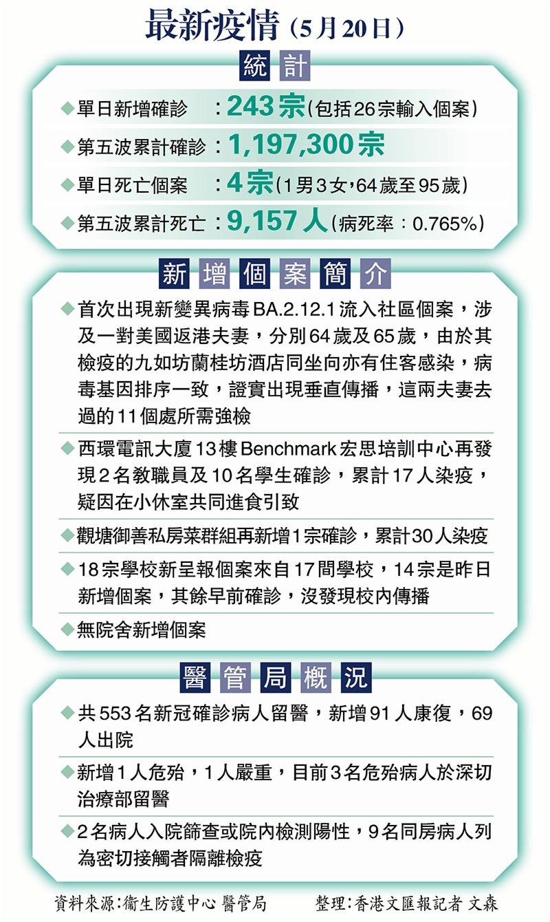 宏思禦善兩群組增至47人確診 衞生防護中心昨日公佈,前天發現的上環培訓機構“Benchmark 宏思”群組新增12名師生確診,累計17人染疫,懷疑是眾人小休時在休息室共同進食引致。觀塘“禦善私房菜”群組最後兩人完成強檢,再新增1宗確診,累計30人染疫。其餘群組沒有新增個案。昨日無院舍新增個案,學校新呈報18宗陽性個案,來自17間學校,但沒發現校內傳播。 衞生防護中心傳染病處首席醫生歐家榮在疫情簡報會上表示,截至昨日凌晨共新增243宗確診,包括26宗輸入確診個案,還有1宗是第12日社區檢測中心發現陽性個案,但病毒量很低,相信屬於復陽個案。 至於各群組最新進展,中心調查西環“Benchmark 宏思”群組,發現除了前日發現的5人確診,再有2名教職員及10名學生確診,累計17人染疫,包括15名學生及2名教職員。發病日期介乎5月13日至5月20日,大部分人是在5月16日至19日陽性,相信爆發很可能發生於5月11日至15日的課程,當時有30多名學生,其中有15人檢測陽性。 中心調查發現,該機構上課時師生雖然均佩戴口罩,但有學生發言時口罩沒正確罩住口鼻。小休時,師生在休息室有脫下口罩進食及喝水,相信由此發生傳播。中心在課室、桌面及休息室提取了20個環境樣本,正等待化驗結果。 4患者離世 3人無打針 至於至少4名宏思學員曾光顧的上環譚仔三哥米線分店,歐家榮表示,該食肆暫無新個案,16個環境樣本在經檢測後均呈陰性。該食肆至今累計共有5宗確診。 在學校方面,昨日新增18宗呈報個案,涉及17間學校、13名學生及5名教職員。其中,有4人於前天確診,14人昨日呈陽。有一間小學有2宗個案,包括1名學生及1名教職員確診,但兩人並無接觸,沒發現校內傳播,相信是各自在社區內感染。 另外,公立醫院昨日新增4名確診病人離世,包括1男3女,年齡介乎64歲至95歲,其中3人沒有打疫苗,1人打三針。沒有死者來自院舍。 周末前夕蘭桂坊人頭湧湧皆循規 昨日是酒吧復業後的首個小周末,蘭桂坊大部分酒吧都人頭湧湧,在露天區的數十張枱都坐滿人。 據記者現場觀察,大部分顧客都自覺遵守防疫規定,進入酒吧前掃“安心出行”二維碼,也沒有超出4人一枱的限制。各酒吧職員高度戒備,穿梭於顧客間提醒客人掃碼。警方亦在酒吧區加強巡查,提醒業界和市民遵守防疫措施。