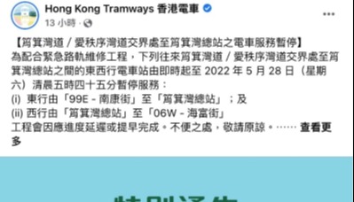 香港中通社圖片 4、政府修例提升院舍最低人手規定和人均面積,加強院舍服務質素。本身亦經營院舍的安老事務委員會委員李輝26日在一個電台節目表示,院舍人手供應越見困難,行業前線護理員、復康人員均面臨嚴重短缺,預計全港欠缺500至600名護士配合新法例。 5、25日下午接連發生電車出軌事故,據報3輛電車在筲箕灣電車總站“迴旋處”掉轉駕駛方向時,先後在同一位置出軌。香港電車指,為配合緊急路軌維修工程,下列往來筲箕灣道/愛秩序灣道交界處至筲箕灣總站之間的東西行電車站由即時起至5月28日清晨5時45分暫停服務: 6、遲來的香港巴塞爾藝術展於25日香港會展中心新翼終於開跑,除即日起至27日的貴賓預展場外,28日、29日連續兩日將對購票的公眾開放。隨着香港疫情管控措施有限度放寬,首日(VIP預展日)的巴塞爾現場甫過午後已可見到逐漸密集的客戶人流,因應疫情,今年的巴塞爾VIP日,展覽場內已不見以往為客戶提供的流動香檳推車,參觀者打卡拍照也都嚴格戴口罩,作為本港最大型的藝博會,防疫措施非常到位。